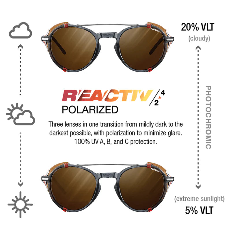 Leave your mark with the Legacy. Inspired by Julbo’s classic glacier glasses like the Cham and Vermont Classic, these progressive throwbacks blend vintage vibes with modern styling for a fresh, fun and iconic look that stands out as much as you do. The metal-plastic frames are lightweight and durable, and leather side shields block extreme sunlight and can be easily removed for everyday wear. Adjustable slim temples can be customized for a perfect fit, while Grip Tech and a no-slip nose bridge offer reliable security and unparalleled comfort. To complement the Legacy’s inimitable style, each pair comes with a premium felted soft case.