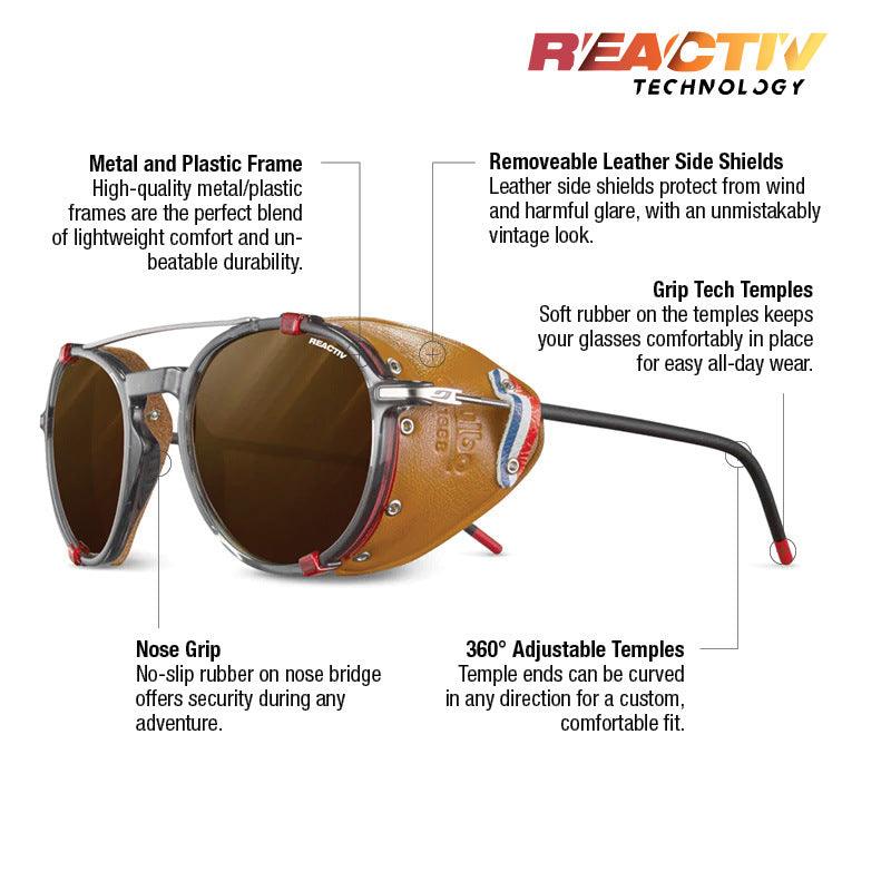 A compact, vintage-inspired metal-frame sunglass updated with REACTIV or Spectron lenses for bold style and dynamic light performance.