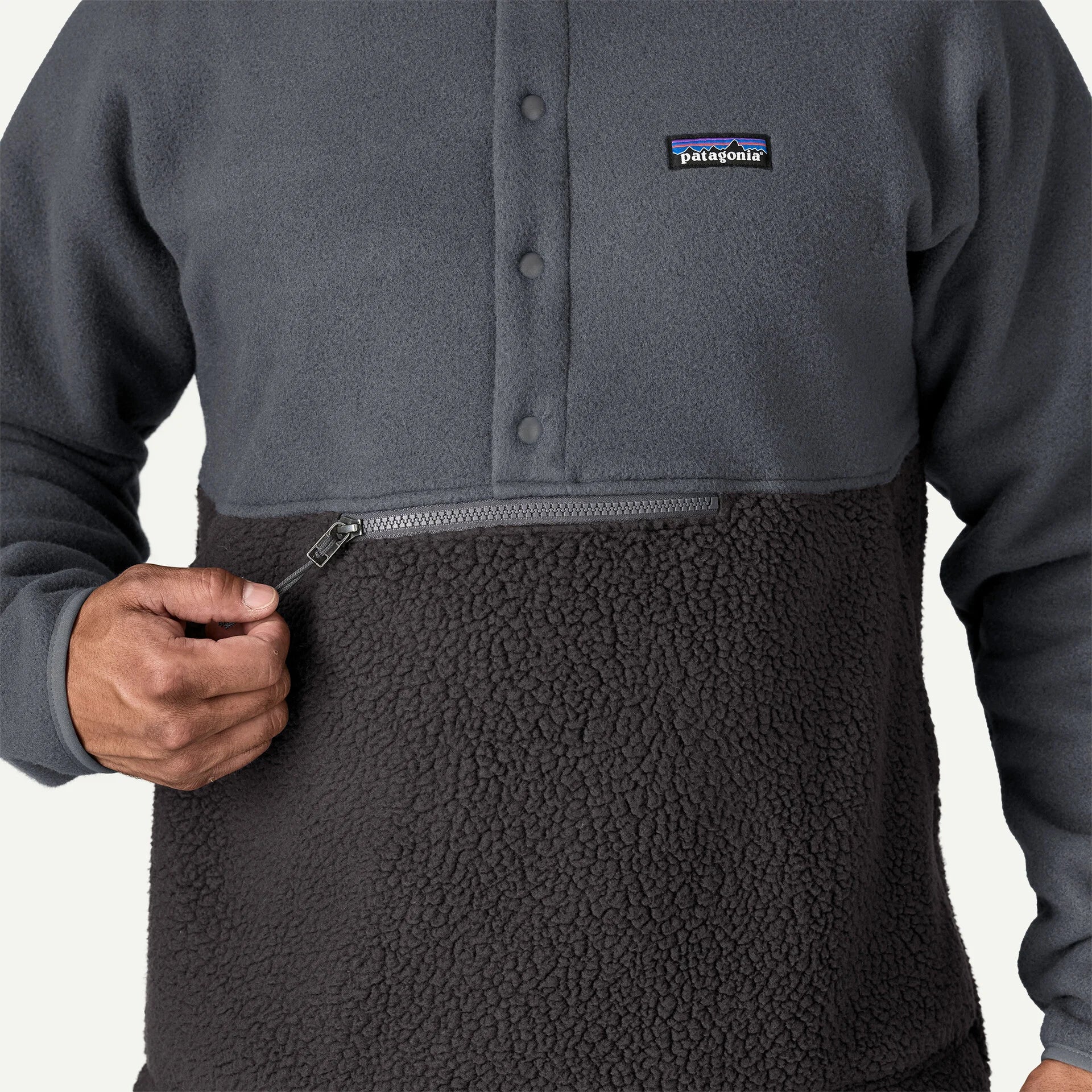 Upper body and sleeve fabric is made with Synchilla® 100% recycled polyester double-sided fleece, and the lower body fabric is Polartec® 100% recycled polyester double-sided shearling fleece